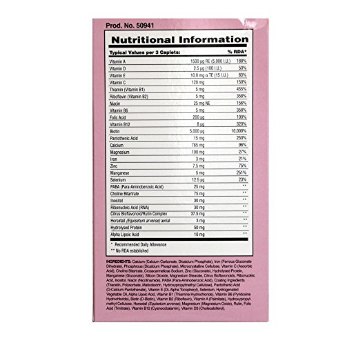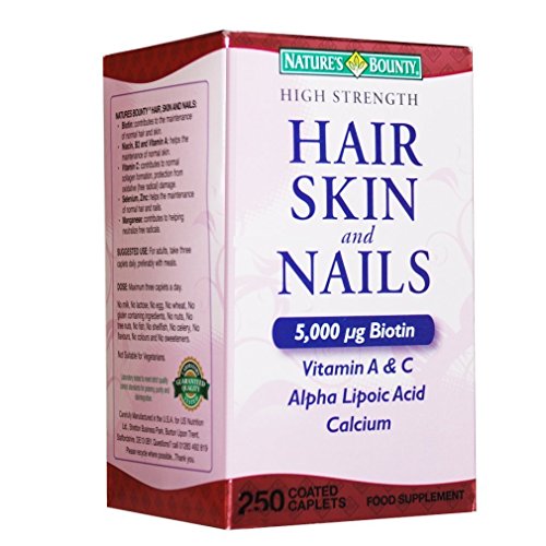 Nature's Bounty Hair Skin and Nails coated tablets provide a combination of nutrients consistently found in healthy hair, skin and nails. This supplement is guaranteed free of: wheat, gluten, milk, lactose, sugar, preservatives. Other vitamins, A,C,D, E, B-1,B-2,B-6, Niacin more. Also Calcium, Iron, zinc, magnesium are included.Feature