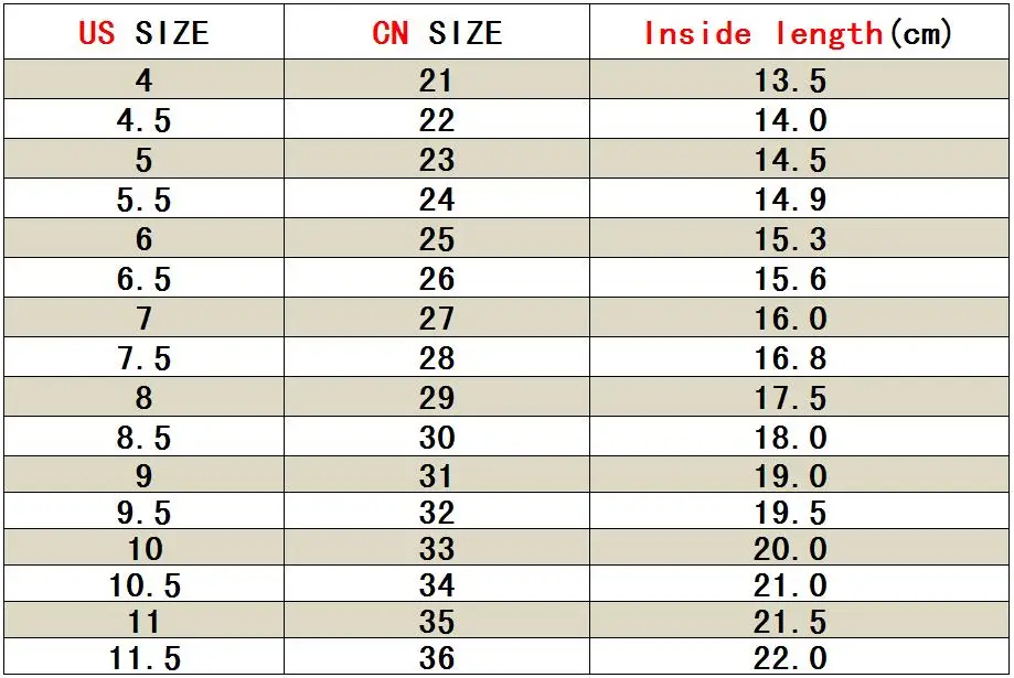 1:The US size is not standard,Just convenient for you to do order.Please choose size depend on inside length. And there is only CN size on shoes.Please refer to CN size when received the goods