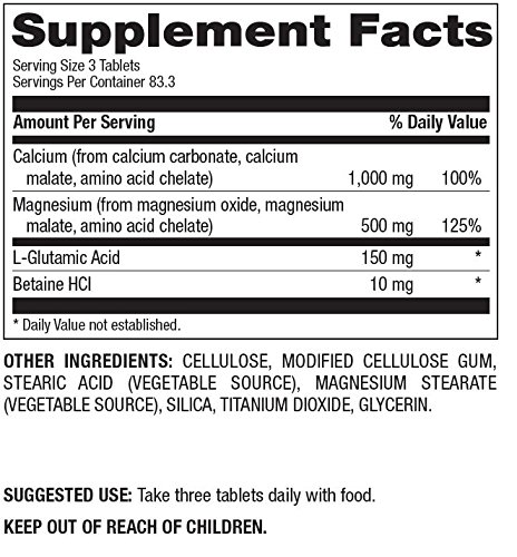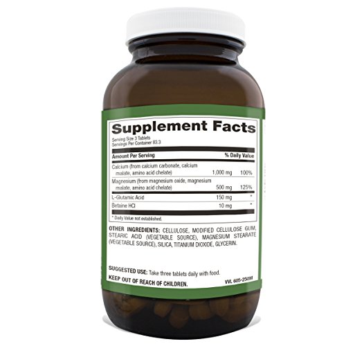 CALCIUM AND MAGNESIUM IN A PERFECTLY BALANCED FORMULA - Our 2:1 complex contains the perfect combo of Calcium carbonate, malate, chelate and Magnesium oxide, malate, and chelate for optimal absorption. We've also added amino acid L-Glutamic and Betaine HCI for added benefits and absorption.