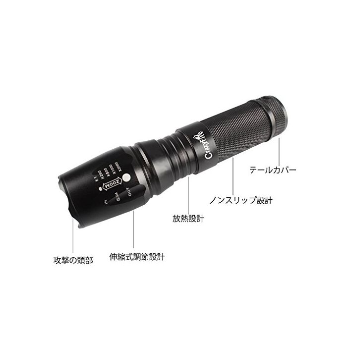원본상품명:CrazyFire 中電 1200ルメン アウトドア IPX45 ハンディライト 高性能調節可能な焦点距離ズム式 5モド サイクルライト 自車ライト 充電式ライト