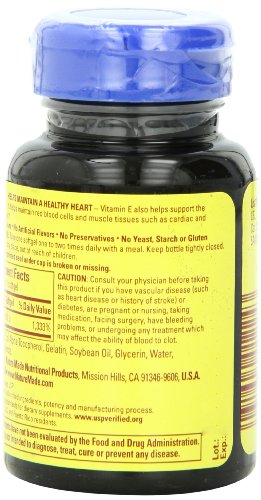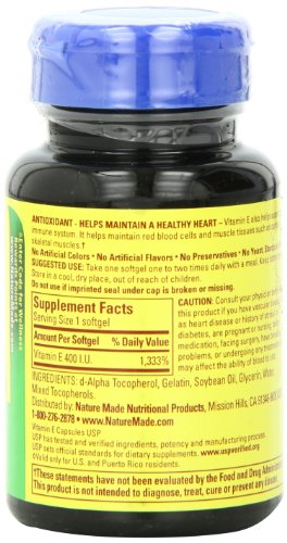 -. Binding : Health and Beauty -. Brand : Nature Made -. EAN : 0031604012243 -. Feature : Pack of three, 100 soft gels (300 total soft gels) / Recommended as part of daily regimen for heart health, longevity, prenatal care, and memory / Provides an antioxidant that fights against damaging natural substances / Protects cells from compounds such as lead and mercury -. IsAdultProduct : 0 -. Label : Nature Made -. Manufacturer : Nature Made -. MPN : 031604012243 -. NumberOfItems : 3 -. PackageQuantity : 3 -. PartNumber : 031604012243 -. ProductGroup : Health and Beauty -. ProductTypeName : HEALTH_PERSONAL_CARE -. Publisher : Nature Made -. ReleaseDate : 2015-06-22 -. Studio : Nature Made -. Title : Nature Made Natural Vitamin E 400IU, 100 Softgels (Pack of 3) -. UPC : 031604012243