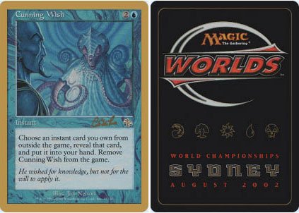 -. Binding : Toy -. Brand : Magic: the Gathering -. Edition : World Championship Deck Singles -. Feature : A single individual card from the Magic: the Gathering (MTG) trading and collectible card game (TCG/CCG). / This is of Rare rarity. / From the World Championship Deck Singles set. -. IsAdultProduct : 0 -. Label : Wizards of the Coast -. Manufacturer : Wizards of the Coast -. ProductGroup : Toy -. ProductTypeName : TOYS_AND_GAMES -. Publisher : Wizards of the Coast -. Studio : Wizards of the Coast -. Title : Magic: the Gathering - Cunning Wish - World Championship Deck Singles