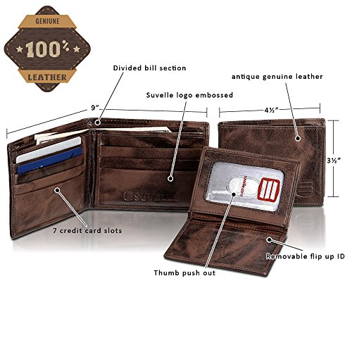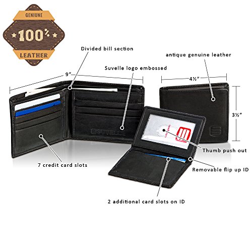 -. Binding : Apparel -. Brand : Suvelle -. Department : mens -. Feature : Made of soft rich genuine leather that is stylish, modern and timeless The Suvelle wallet offers fashion and function ideal for everyday or travel use and a sleek design ensures comfortable carrying in any pocket / Divided bill section helps split larger bills from smaller ones easily and to stash cash, checks, and receipts, 7 cards slots 4 on one side of the fold and 3 on the other side of the fold ideal to hold all of your credit cards, debit cards, insurance cards, and rewards cards, 2 slip pockets one on each side behind the card slots are ideal for photos, ATM slips or receipts, a removable flap flip up ID window / Easily show your ID without taking it out of your wallet, and easily remove ID if asked as well with the removable flip up ID flap, features a clear ID window with a thumb-slide ensures to get the ID out with ease with 2 additional card slots on the ID flap / Embossed Suvelle logo at the front offers a subtle touch of brand identification and a single- needle stitching featuring around the perimeter is for the finishing touch / Available in: Black leather and Brown antique marbleized leather, Approximate Dimensions 4 ½ W X 3 ½ L when closed and empty, 9 W X 3 ½ L when open and empty -. Model : W031 -. ProductGroup : Apparel -. ProductTypeName : ACCESSORY -. Size : Medium -. Title : Suvelle Men's Cow Leather Bifold Wallet Removable Flip up ID Window # W031