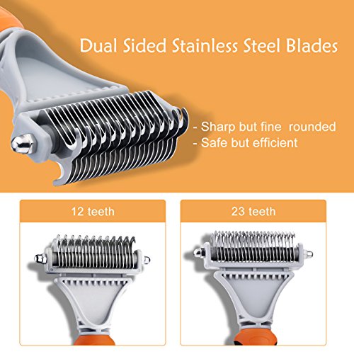 Dual Side Stainless Steel Blades (12 23teeth): Double Sided De-matting Comb/Rake gently removes Loose Hair, and eliminates Tangles, Knots, Dander and trapped Dirt of your pet. The 12 teeth side for stubborn tangles and the 23 teeth side for faster results or thinning and de-shedding. Works great on dogs, cats, horses, rabbits, etc. Safe No Scratch: The Comb is designed with SHARP but fine rounded teeth, which can groom the undercoat easily without scratching or hurting you and your pets. This comb enables you to groom your pets' hair and at the same time give them the most comfortable massage! Ergonomic Non-Slip Handle: Ergonomic non-slip comfort handle made with ABS/TPR; Corrugated soft rubber in dual side of handle prevents grooming fatigue; The handle has a hole witch can be hooked on wall. Best Results: With the stylish design, you can have the best results when use it. The comb is built to last with the sturdy and durable construction.