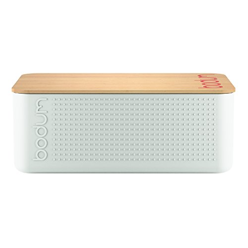 -. Feature : Bread Bin/Box comes from Bodum's Bistro range. / Bamboo lid which, when removed, can be used as a bread board / Body of the bin is fitted with an adjustable vent / Overall length 6cm/14,2in, width 23cm/9in, height 14cm/5,5in.