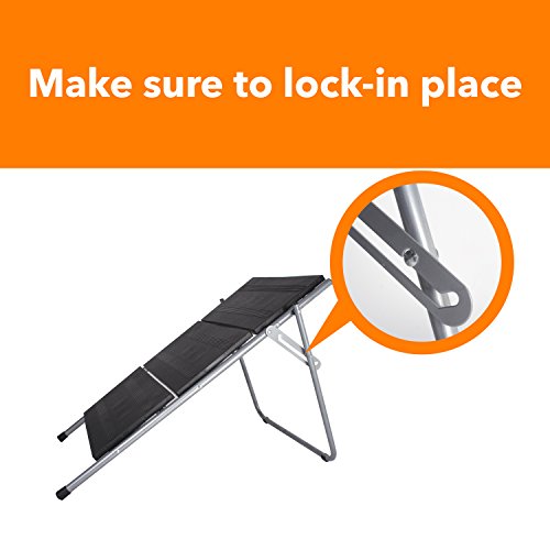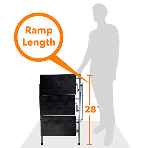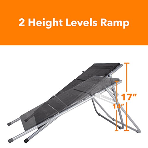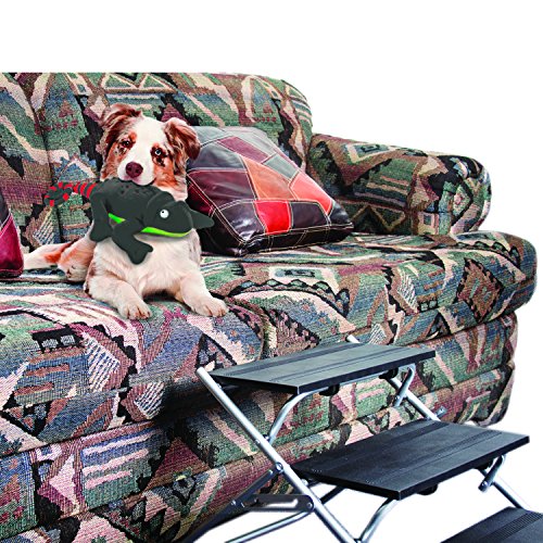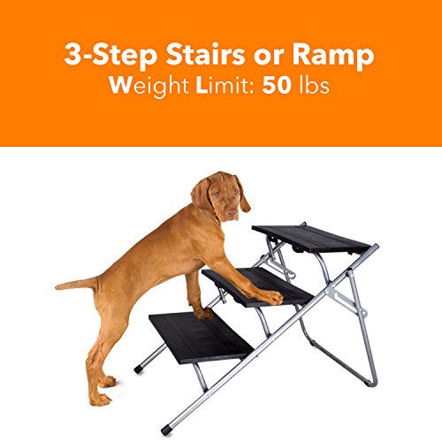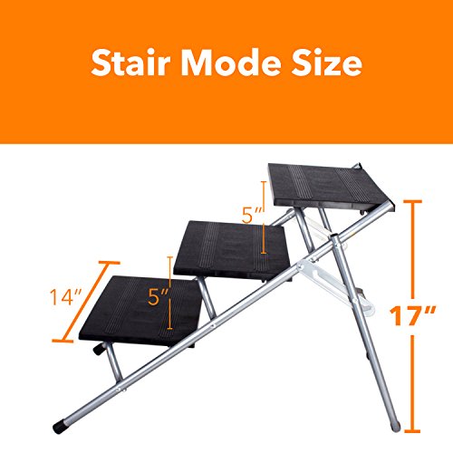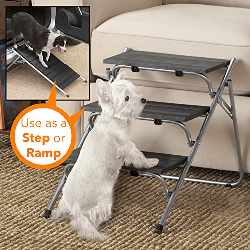 This sturdy folding pet stairs and ramp helps your pals get safely to a favorite spot and keeps them from straining their back or risking injury by having to jump down. Use it for your couch, car, bed, and more. The doggy steps for car is essential for small dogs or cats struggling to join you on the couch or bed, and ideal for older pets with hip or joint problems. The doggie steps also ensure that your furry friends can climb securely into your car or truck. The dog ramp for SUV is also great for seniors or those with injury, it prevents you from having to bend down and pick up your pet. The dog ramp for small dogs has a sturdy metal construction and rubber steps for safe gripping. Assembly for the dog car ramp is not required. For added convenience, the stair ramp folds for easy storage and portability. When set up, the pet steps for dogs measure 30 inches in length, 17 inches in width, and 17 inches in height.Feature