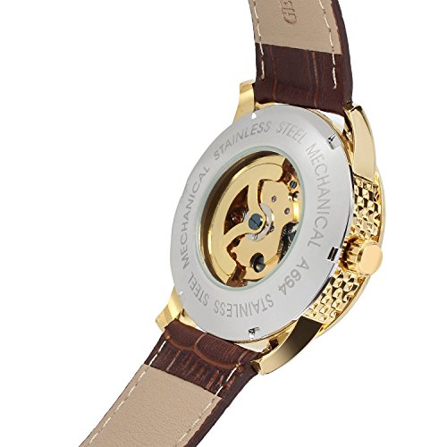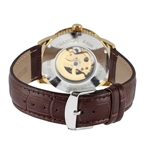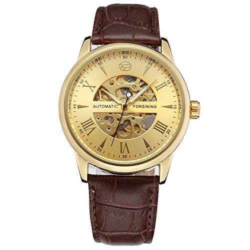 -. Binding : Watch -. Brand : GuTe Mechanical -. Department : Mens -. EAN : 6661200376575 -. Feature : GuTe-picked FORSINING Casual Dress Style self-wind Wristwatch for Gentlemen / Golden Face Skeleton See-through with Roman Numerals / Gloss Gold tone Argyle Pattern Watch Case 41mm Diameter Dark Brown Faux Leather Strap / Luminous Hands. Automatic Rotor in the Back Cover Case. Also you may do hand-winding by the Watch Crown / This Watch ONLY can Do Splash-proof. Not exactly water-resistant actually. Come with GuTe minimalist Cardboard Watchbox with No Instruction. ECO-Packaging -. Label : GuTe Trade -. Manufacturer : GuTe Trade -. MPN : JWH185-GBR -. PackageQuantity : 1 -. PartNumber : JWH185-GBR -. ProductGroup : Watch -. ProductTypeName : WATCH -. Publisher : GuTe Trade -. Studio : GuTe Trade -. Title : GuTe Elegant Gold Tone Luminous Mens Automatic Mechanical Wristwatch Dark Brown Strap