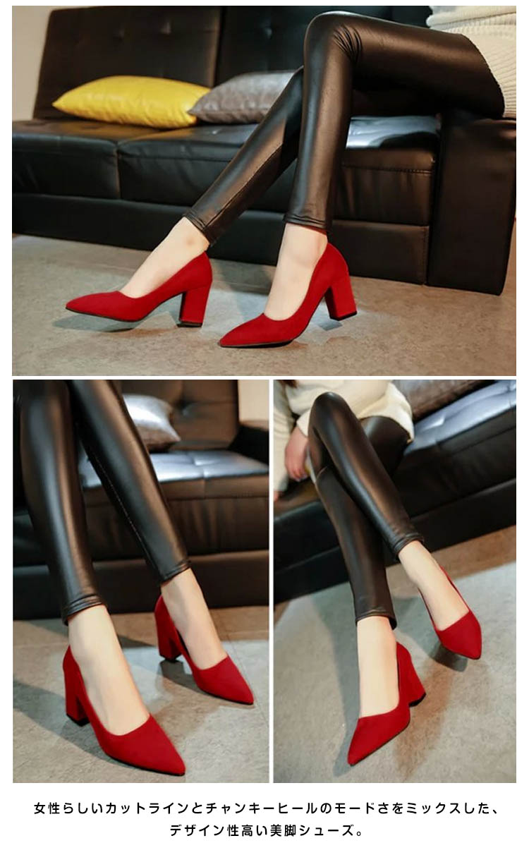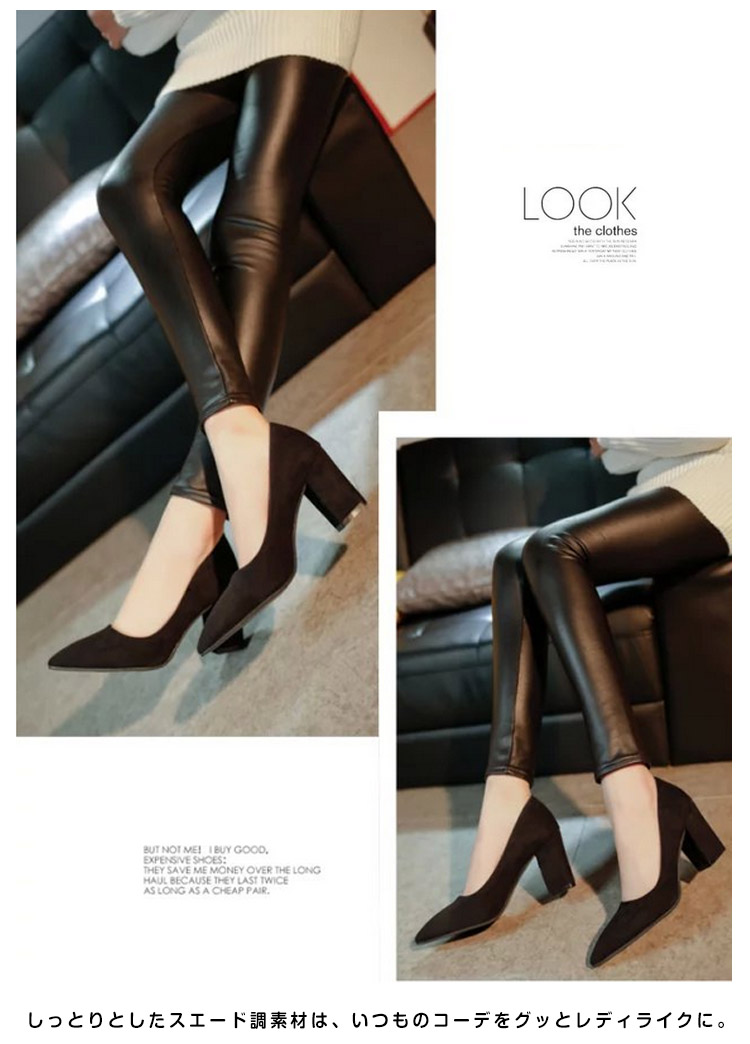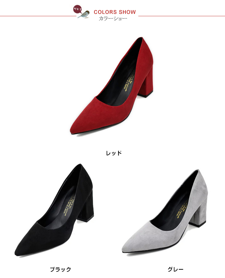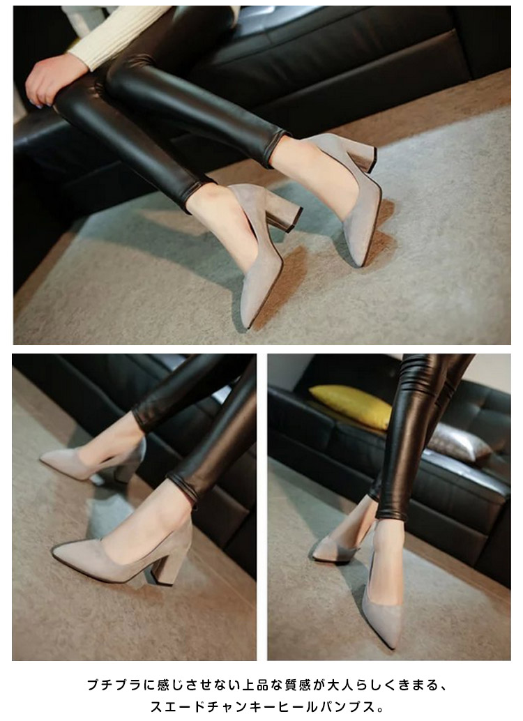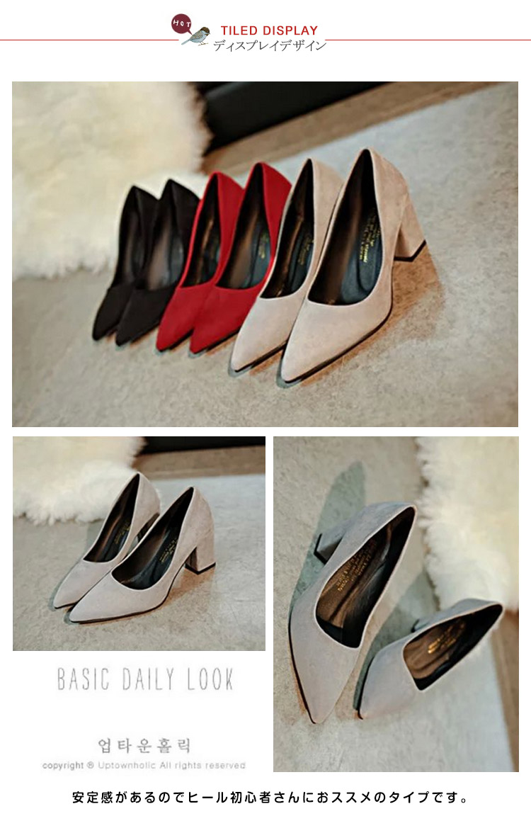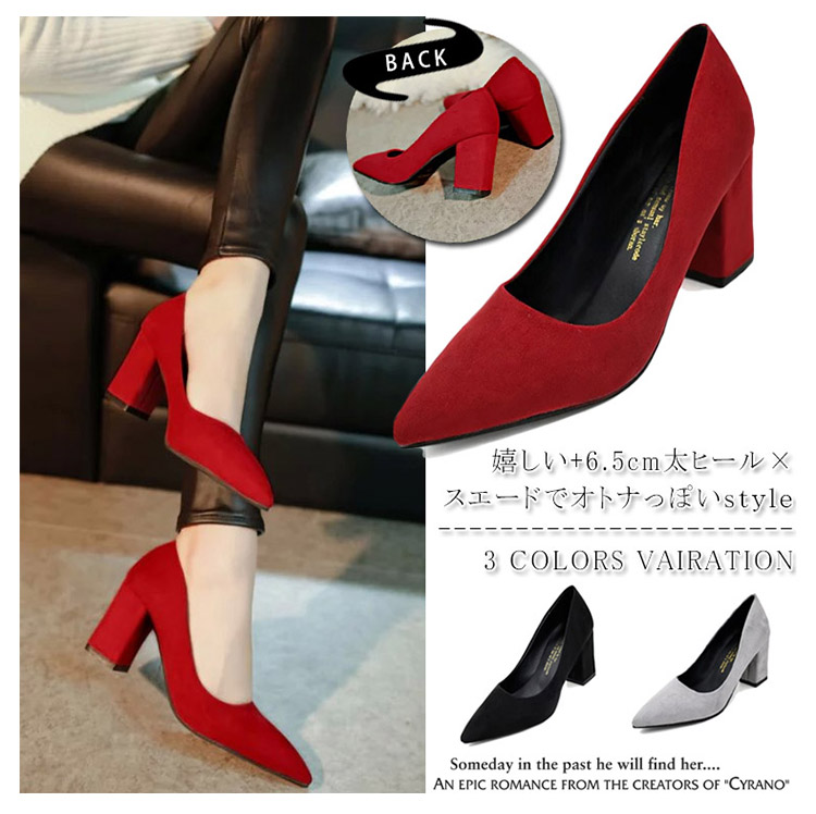| 嬉しい+6.5cm太ヒール×スエードでオトナっぽいstyle。プチプラに感じさせない上品な質感が大人らしくきまる、スエードチャンキーヒールパンプス。女性らしいカットラインとチャンキーヒールのモードさをミックスした、デザイン性高い美脚シューズ。しっとりとしたスエード調素材は、いつものコーデをグッとレディライクに。さらに22.0cm?24.5cmまでの豊富なサイズ展開も魅力!G750安定感があるのでヒール初心者さんにおススメのタイプです。 | |