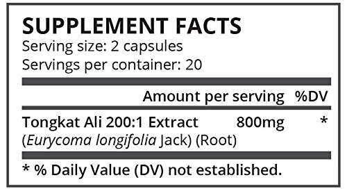 HIGHEST POSSIBLE DOSAGE IN AMAZON AT 200:1 EXTRACT STRENGTH: Most Potent Tongkat Ali Extract on Amazon, made from 200 grams of wild-crafted Eurycoma Longifolia Jack roots to obtain just 1 gram of extract, the highest extract strength 200:1 in the market. Each capsule contains 80g of Tongkat Ali Extract.