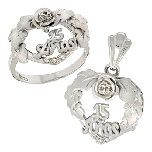 -. Title : Sterling Silver Quinceanera 15 Anos Heart Wreath Ring & Pendant Set CZ Stones Rhodium Finished