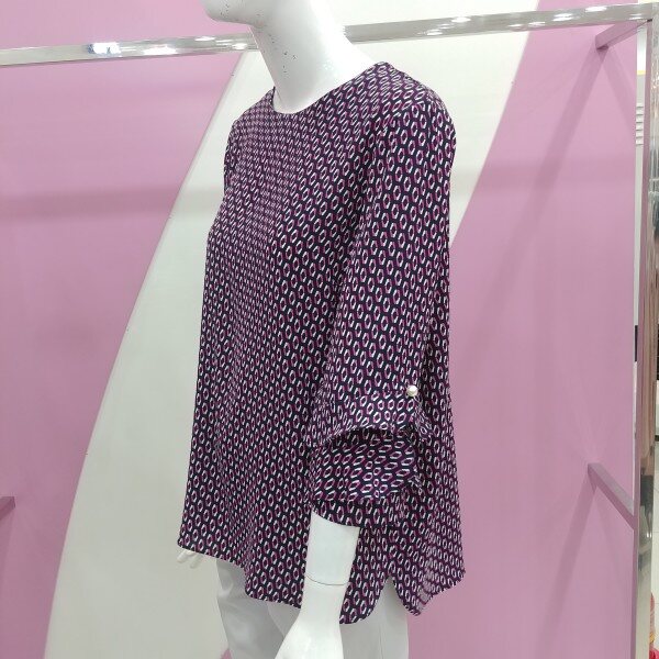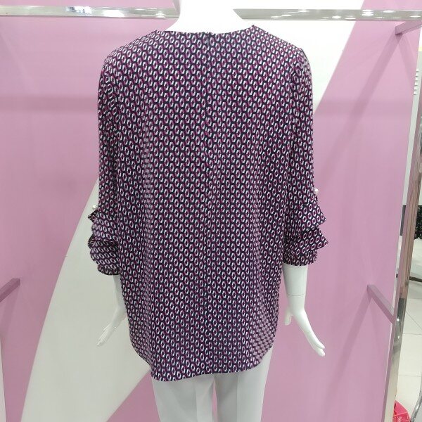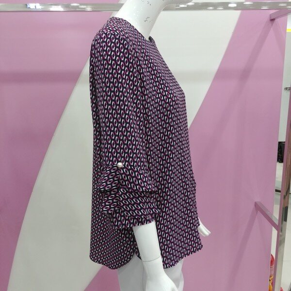 7부 소매기장으로 소매에 진주장식과 프릴 스타일로 포인트를 준 패턴모양의 블라우스.하나만 입어도 력셔리하게 표현되는 블라우스.정사이즈 구매.