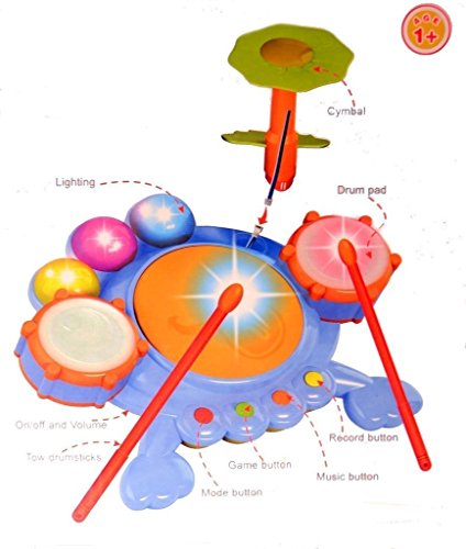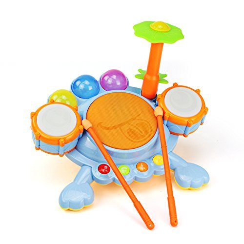 Future rockstars would love to drum away to glory on this electronic musical toy set. It comes packed with various lights, volume control and 16 fun sounds plus melodies. The automatic shut-off feature preserves battery life. It also has a unique record mode. Develops coordination and visual skills. Stimulates sense of hearing among kidsFeature