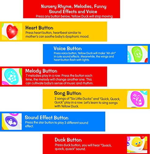 Allow your child to observe and explore various functions of this toy. A button with a picture of 2 stars-makes three different sounds. A button with a picture of a duck and a musical note - plays 2 different songs. A button with a picture of a star and musical notes- plays many different tunes. A button with a picture of a duck's face - when pushed says "uh oh". The red heart button makes a sound of a beating heart. The little duck button on its belly says "quack quack"