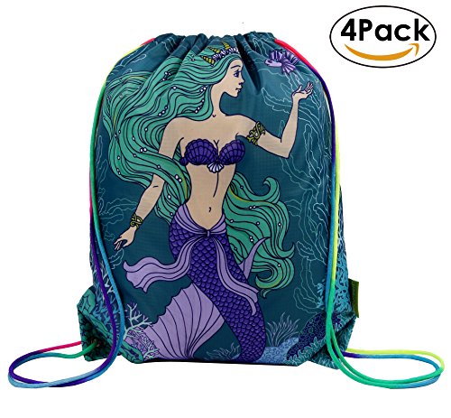 Mermaid Party Supplies Bags for Kids Girls, 4 Pack Drawstring Gym Backpack for Party Favors Gifts