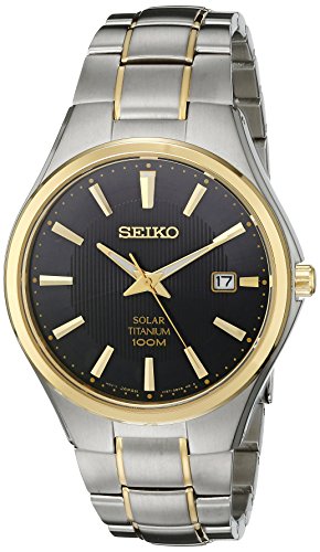 The Seiko Men's Two-Tone Titanium Solar Watch is the perfect fashion accessory for work or play. It provides a sleek look while bringing optimum functionality to your day, thanks to luminous hands and markers as well as a date window. And no battery change is ever required as this water-resistant mens watch is powered by all types of light energy and has a 10-month power reserve once fully charged.Feature