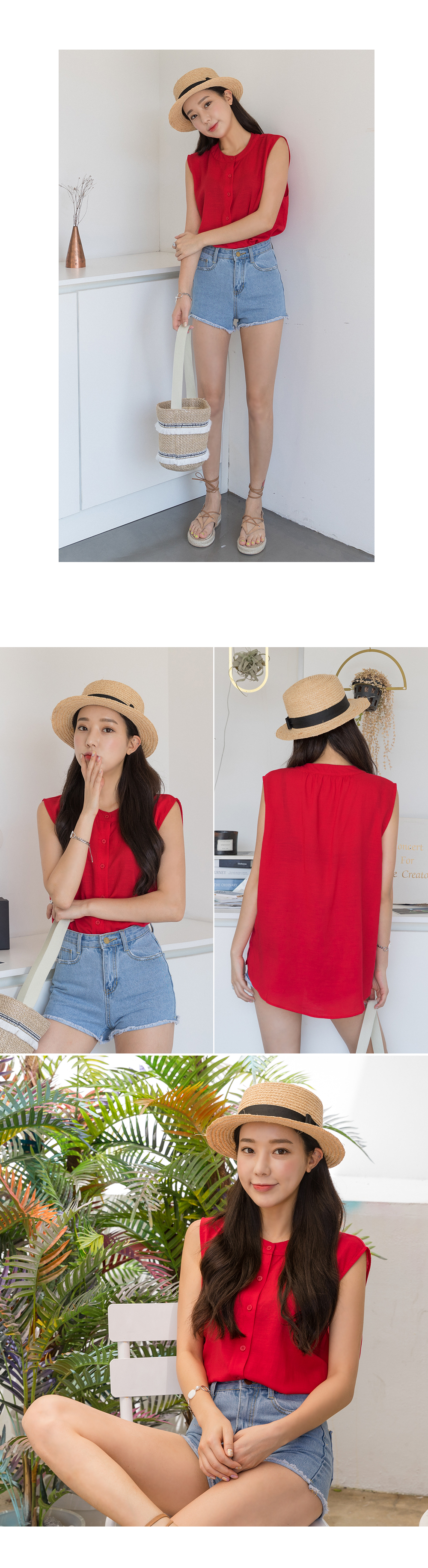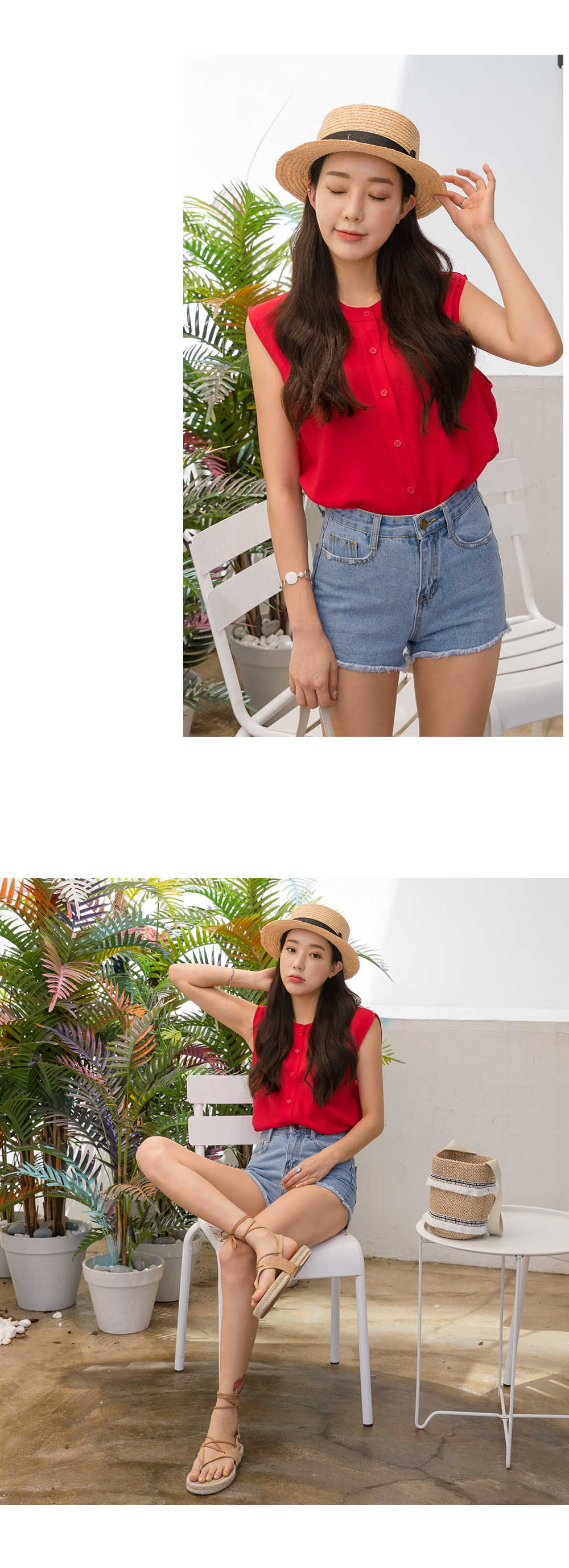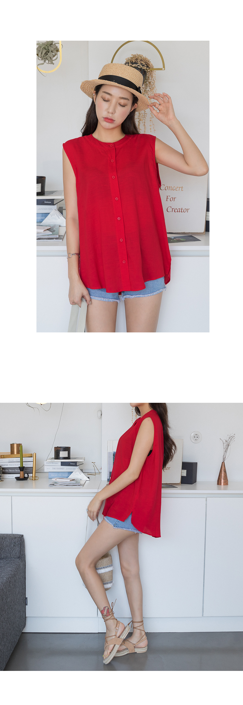 "시원한 느낌의 프린트 린넨&요루폴리 민소매 블라우스!"