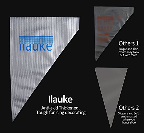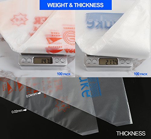 Upgraded version: 0.04MM thick, thicker than mainstream pastry icing bags(only 0.02MM). The THICKER, the BETTER texture, can withstand powerful extrusion. You can apply as many pressure as you need without worrying pop.