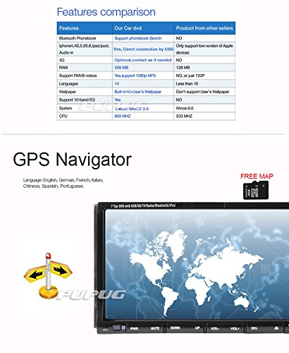 -. Feature : Windows CE 8.0 HD touchscreen:Classic Windows CE 8.0 operating system,you can sliding screen page to operate your car DVD player with sliding High-Definition screen smoothly.USB Flash Drive and SD Card Support:you can download flim or music from internet into your card and insert into your car DVD player then you can enjoy it. / GPS Navigation car video player, free newest official GPS navigation SD map card(North America/Europe/Australia etc).you can get anywhere show on map with GPS guidance.Dual Zone Function,you can make phone call with Bluetooth built-in microphone and play video or music while GPS navigation running. / Multi Function car kit,Touch Screen, Steering Wheel Control, GPS navigation,RDS, DVR,SD/USB Support, Remote control,FM Transmitter, Subwoofer Output, 3D Interface, iPod Connection, Built-in Bluetooth,car logo setting,Auxiliary Input.Built- in Bluetooth with Microphone:you can enjoy streaming music and make hands-free phone calling while enjoy driving. / AM/FM Radio player,Radio Response Bandwidth frequency,AM: 522 KHz-1620 KHz;FM: 87.5 MHz-108 MHz.Country:China,Europe,Eastern,Russia,USA1,USA2,Japan etc.Multi media video player compatible VCD,PG, RMVB, DVD, DVD-RAM, JPEG, Mp3, CD-R/RW, MPEG4, DVD+R/RW, PDF, PNG, DIVX, Mp4, WMA, CD+R/RW, CD, AVI, DVD-R/RW almost format. / Steering wheel control function:you can operating you car stereo with your steering wheel safely without touching car radio audioMulti-languageoptional,English,Chinese,Spanish,German,French,Italian,Portuguese,Russian,Polish,Turkish,Korean,Japanese,Danish,Dutch,Swedish,Hebrew etc.