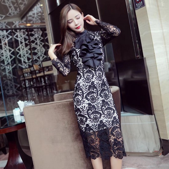 ワンピース ミモレ丈 レディース ドレス フリル ハイネック レース 花柄 ブラック シースルー タイト エレガント 上品 大人 フェミニン セクシー お呼ばれ drgz0731