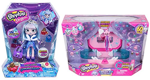 -. Feature : The most to die for Shopkins set of the year! The EXCLUSIVE Gemma Stone Shoppie and the Shopkins Jewelry Creation Box Set! / Gemma Stone comes with 1 doll, 1 doll stand, 1 purse, 4 EXCLUSIVE Shopkins, and 1 VIP card. Gemma's outfit is head-to-toe glamour! A pearl crown, fur-trimmed hooded cape, sparkling dress, glitter stockings and translucent gem-inspired heels. Her 2-toned hair is icy blue and lavender, with strands of silver to match the diamond sparkle in her eyes. Gemma is packed with 4 exclusive Shopkins known as the Gleam Team! / Create the cutest jewelry using cute Shopkins Charms! There are 18 exclusive Shopkins charms and 40 beads to combine and create great bracelets and necklaces! It's the perfect way to wear and share your favorite Shopkins! And when they're not on your arms, keep your charms safe in their lockable Jewelry Box! Comes with 4 charm bracelets and one necklace, plus an exclusive Zara Star Pendant! Over 60 pieces in all! / Jewelry box has 3 compartments to hold all of the included beads and charms (plus more!) and is equipped with a lock for safekeeping.