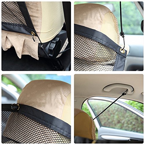 -. Feature : Net Barrier Fits most cars//trunks/SUV. / Keep your pet at the back and make your drive safe. Durable see through mesh, pet's claws won't get caught. / Many pets likes steps over it onto the console,with the car back seat barrier,keeps pets from launching into front seat. / Durable and long lasting, strong hook in bungee cords is not easily deformed, protective cover designed won't hurt the dogs. / Easy to Install and Remove: The net barrier is easy to Install and remove with hooks and adjustable strips. Can be attached either to the handles above the door or the front seat headrests.
