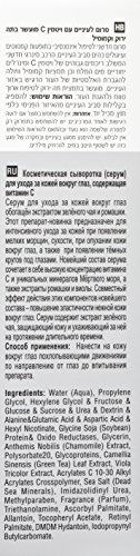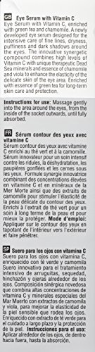 Eye Serum with Vitamin C, enriched with green tea and chamomile. A newly developed eye serum designed for the intensive care of fine lines, dryness, puffiness and dark shadows around the eyes. The innovative synergetic compound combines high levels of Vitamin C with unique therapeutic Dead Sea minerals and essence of chamomile and viola to enhance the elasticity of the delicate skin of the eye area. Enriched with essence of green tea for long-term skin care and protection.Feature