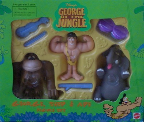 -. Feature : George of the Jungle George, Shep and Ape Figure Set. / The 3 PVC figures are a little over 3 inches tall. / George comes w/bongo drums, Ape w/violine and Shep w/stick. / Made by Mattel in 2000 and long out of production.