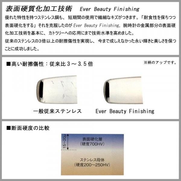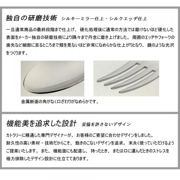 | 仕様 | シルキーミラー仕上 シルクエッヂ仕上 Ever Beauty Finishing ナイフ:刃付 食洗機対応 |