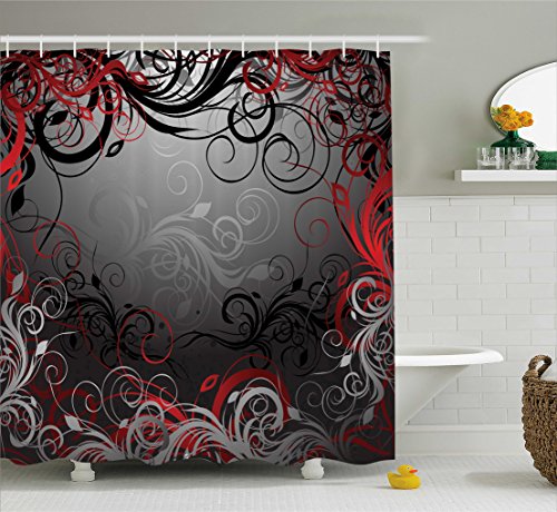Red and Black Shower Curtain by Ambesonne, Mystic Magical Forest Inspired Floral Swirls Leaves, Fabric Bathroom Decor Set with Hooks, 70 Inches, Charcoal Grey Light Grey and Scarlet