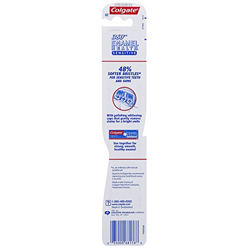 Colgate 360 Enamel Health Sensitive manual toothbrush has 48% softer bristles (vs. an ordinary soft manual toothbrush) to help protect enamel surfaces and gums. It features our unique cheek and tongue cleaner that helps remove odor-causing bacteria, polishing whitening cups that gently remove stains for a bright smile, and raised cleaning tip that helps get into hard-to-reach places.Feature