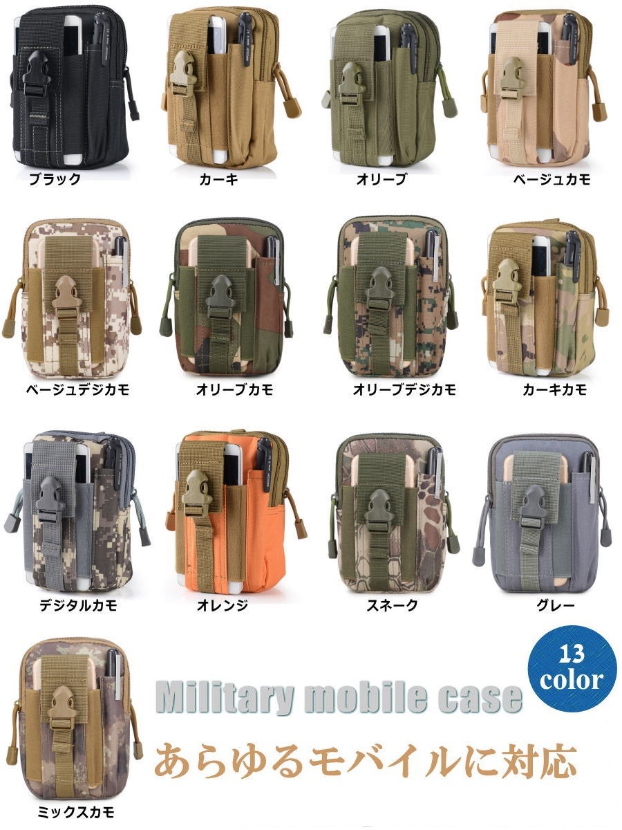 タイトル:スマホケース 全機種対応 Military iPhone7 iPhone6/6Sアイコス ケース iQOS ケース特徴ミリタリーテイストの超COOLなスマホケースが登場!小ぶりながらも圧巻の収納力!どんなスマホでも入るのが嬉しいですね♪ ボディーフィットのケースを装着したスマホも楽々収納可能だと思います。そのままバッグに入れても良し、ボトムスのベルトに通してもOK。 デジカメ等のケースやポーチとしても活躍しそうですね。 ジッパーもスムーズで使い勝手がいいですよ!