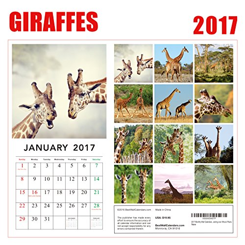 -. Binding : Office Product -. Brand : Best Wall Calendars -. Color : Green -. EAN : 0096362226066 -. Feature : 2017 Calendar featuring beautiful full color photographed images for every month of the year. / Includes Holidays and Observances / Perfect for office spaces, bedrooms, classrooms and more! / Makes a great gift for friends and family! / Keep your appointments and Birthdays organized in one place! -. Label : Best Wall Calendars -. Manufacturer : Best Wall Calendars -. MPN : 26066 -. PackageQuantity : 1 -. PartNumber : 26066 -. ProductGroup : Office Product -. ProductTypeName : OFFICE_PRODUCTS -. Publisher : Best Wall Calendars -. Studio : Best Wall Calendars -. Title : 2017 Giraffes Calendar - 12 x 12 Wall Calendar - 210 Free Reminder Stickers -. UPC : 096362226066