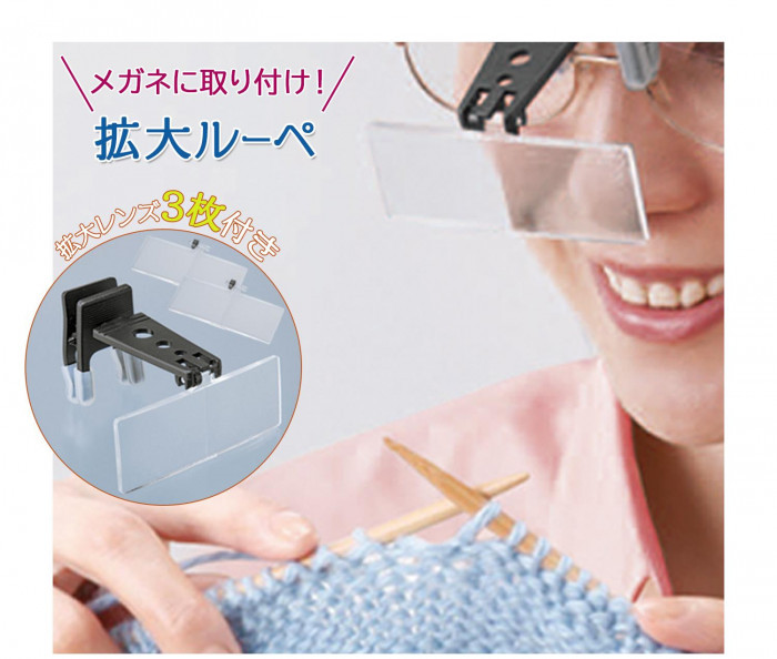 | お手持ちのメガネにワンタッチで取り付けできる、クリップ式の拡大ルーペです。約1.5倍・2.5倍・3.5倍と拡大倍率の違うレンズが3枚付属しており、使用目的や視力に合わせてレンズを使い分けできます。レンズの角度は調節可能で、必要ないときはサッと跳ね上げできます。両手が使えるので、編み物や刺繍、針の糸通し、模型の組立、部品の修理など、細かい作業に最適!男女兼用です。 |
