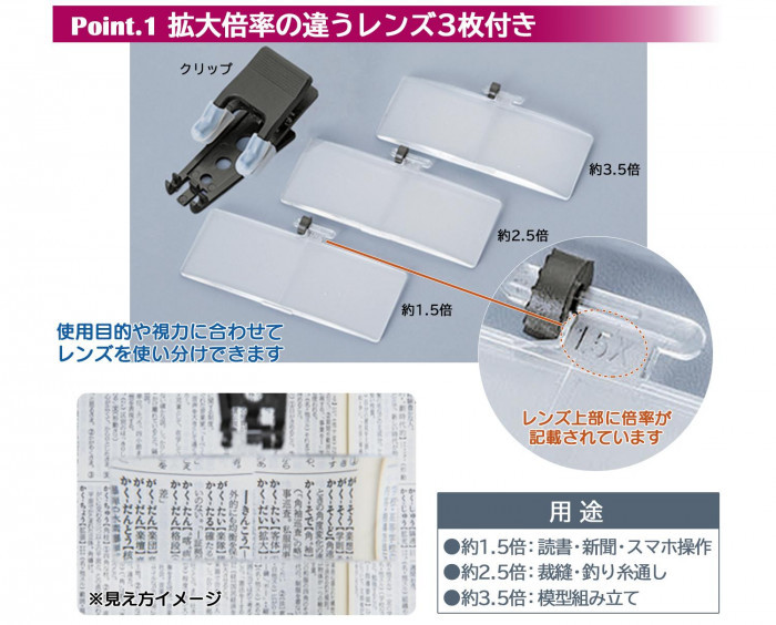 | セット内容 | レンズ3種(約1.5倍・2.5倍・3.5倍) クリップ |