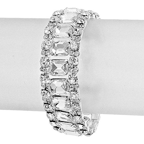 -. Feature : Three row clear rhinestone link bracelet measuring ¾ inches wide. / 7 inches in length with a 2 inch extender. / Prong-set faceted rectangular and round cut rhinestones. / Silver-tone setting. / Lobster clasp closure.