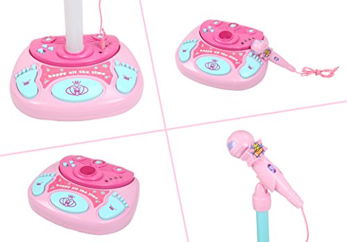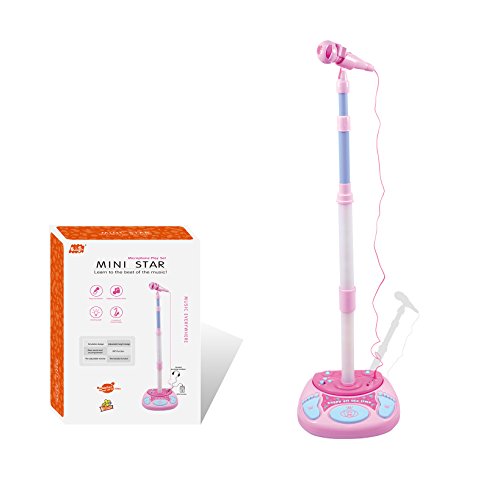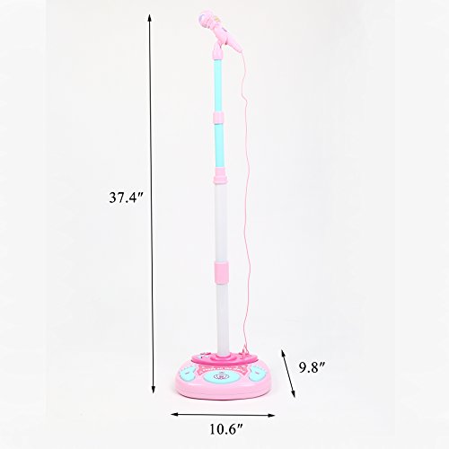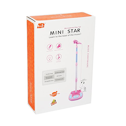 ♪Material and size: made of eco-friendly plastic with bright color , sturdy and non-toxic, safe for your children to play. Product size: about About 27*25*95CM. This stand up microphone toy play set can be adjustable height up to 95cm tall.