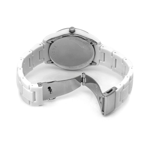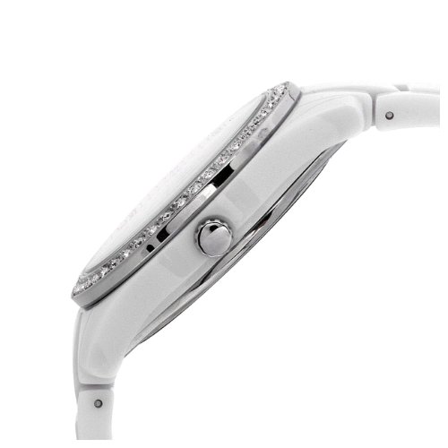 - Feature : Round white watch with 37 mm resin case and mineral dial window / Analog quartz movement with analog display / Featuring three subdials, stainless steel bezel with crystal studding, fluted crown, placed indices, and white resin link bracelet with buckle closure / Water resistant to 165 feet (50 meters)