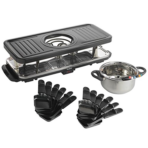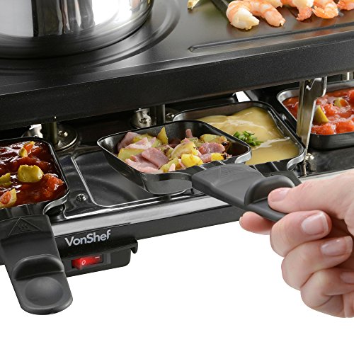 Unlike other Raclette grills, our model combines a grill and fondue set, getting the best of both dinner party experiences. Although fondue is traditionally a communal pot of melted cheese which bread is dipped into, over the years there have been modernization's to the concept too. You can fill the pot with oil, and cook a variety of raw meats, or deep fry pieces of fish coated in batter. You can even indulge your sweet tooth by dipping fruit into a pot of melted chocolate!