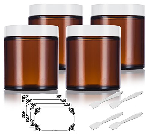 Includes 4- 4 oz Amber Thick Glass Straight Sided Jar with White Smooth Lids + 4 Spatulas & 4 Labels