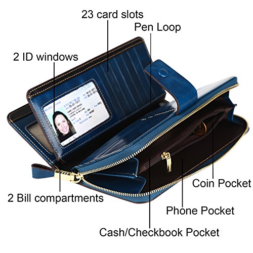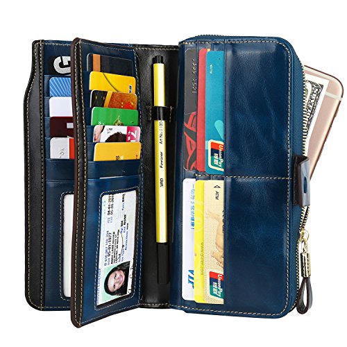 -. Feature : REAL LEATHER - Top grain leather with wax finish, feels luxury and comfortable. Looks even better after using for a long time. / SAFETY & P.R.IVACY - Our wallets are equipped with advanced unique proP.R.Ietary blocking material, which blocks RFID signals and protects the valuable P.R.Ivate information stored on RFID chips from unauthorized scans. Tested & Approved by Independent Test Lab.Tested from 10MHz to 3000MHz, including 13.56 MHz in which the credit cards operate. / FUNCTIONAL DESIGN - 23 credit card slots, 2 clear slots for ID, 2 full-length bill compartments, 2 Large Cash/Checkbook/Phone pockets,1 zippered pocket for change and one Pen Loop. Keep your credit cards,cash,coins,bills,cheekbook and cell phone well organized. FIT for iPhone 6/6S/7 Plus. / Dimensions - 7.67"L x 3.75"W x 1.4"H, It is just the size for a wallet you can simply hold it on hand or put it in bag.Comes with a quality presentation gift box,great for a gift. / 100% MONEY BACK GUARANTEE - We know you'll love our wallet as much as we do, If for any reason you're not 100% SATISFIED, let us know and our customer service team will make things right: full refund or a free replacement, whichever you prefer.