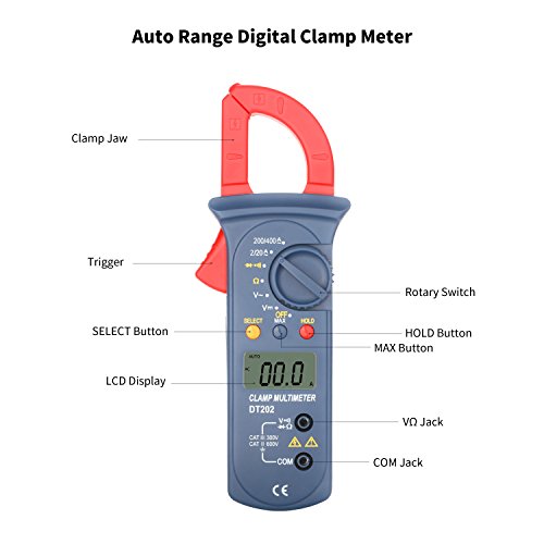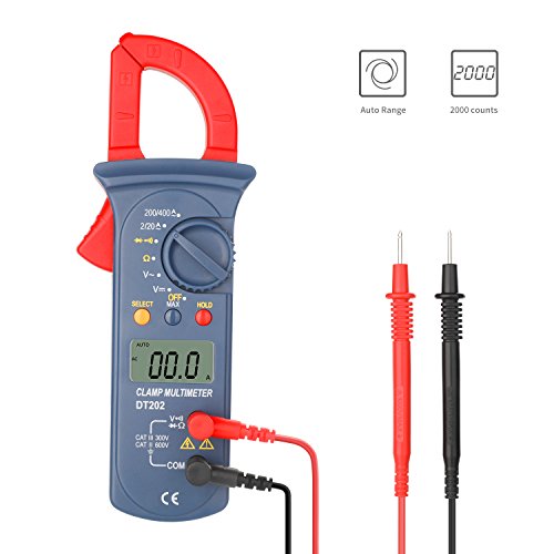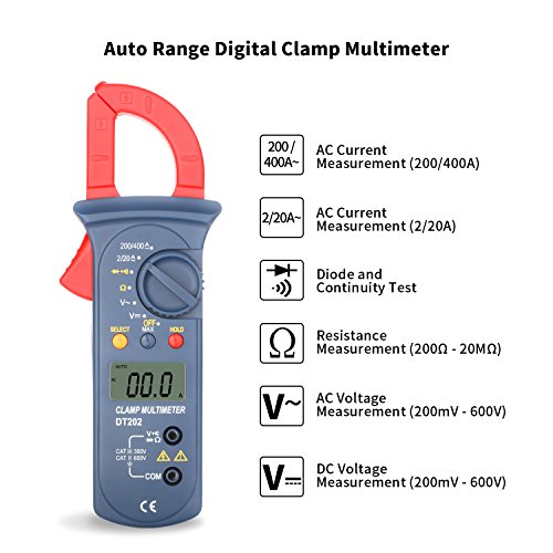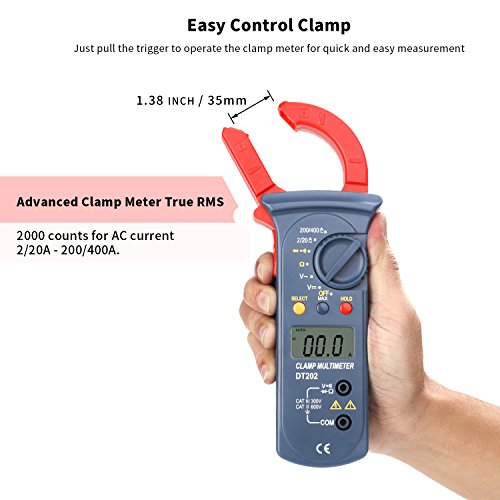 Digital Clamp Meter, Jellas DT-202 Digital Multimeter TRMS 2000 Counts Auto-Ranging Clamp Meter AC/DC Voltage, AC Current, Resistance, Diode, Ground and Continuity Tester.