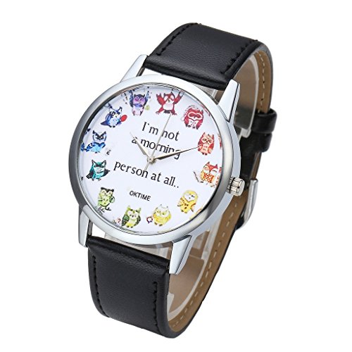 -. Binding : Watch -. Brand : Top Plaza -. Color : White -. Department : Womens -. Feature : Length: 6.5-8.5" Case Dia: 1.5'' / Top Plaza "I'm not a morning person at all!" fashion watch. Cool and unique design. / Material: PU/alloy / Comrs with a grey gift bag printed brand name "Top Plaza", ready for giving. / Not water resistant, please don't get in touch with water. -. Label : Top Plaza -. Manufacturer : Top Plaza -. Model : ATPUS62354 -. MPN : ATPUS62354 -. PartNumber : ATPUS62354 -. ProductGroup : Watch -. ProductTypeName : WATCH -. Publisher : Top Plaza -. Studio : Top Plaza -. Title : Top Plaza "I'm not a morning person at all" White Dial 12 Owls Scale Black PU Leather Band Fashion Analog Quartz Wrist Watch