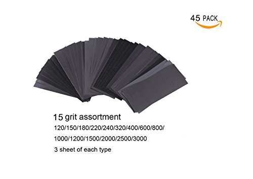 INCLUDED ALL YOU NEED –This kit comes with 3 sheets of each grit in 120/ 150/ 180/ 220/ 240/ 320/ 400/ 600/ 800/ 1000/ 1200/ 1500/ 2000/ 2500/ 3000 totaling 45 sheets