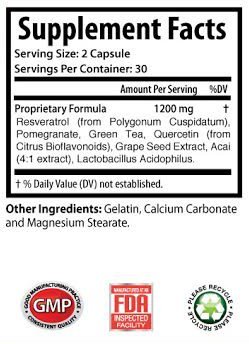 OUR PROPRIETARY FORMULA of 1200 mg: Resveratrol (from Polygonum Cuspidatum), Pomegranate, Green Tea, Quercitin (from Citrus Bioflavonoids), Grape Seed Extract, Acai (4:1 extract), Lactobacillus Acidophilus, Gets the job done for you