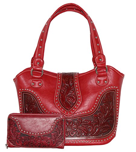 -. Brand : Montana West -. Color : black -. Department : womens -. Feature : Stylish floral tooled genuine leather and PU leather body concealed carry shoulder purse and matching wallet by Montana West. / Spacious main zippered enclosure is divided into two parts by a full length zippered pocket with 2 open pockets and another zippered pocket. / Comes with matching floral tooled leather wallet with change pocket, plenty of credit card slots, 3 money compartments and a removable checkbook cover. / The separate concealed carry compartment is located on the back and has a right vertical access. It measures 9.5" wide x 5" and easily stores all small to medium size framed handguns. / Purse Dimensions:14.5" x 4" x 10.5" (10" drop straps) Wallet Dimensions: 7.5" x 4.5" -. ProductGroup : Shoes -. ProductTypeName : HANDBAG -. Title : Concealed Carry Tooled Leather Shoulder Purse - Concealed Weapon Gun Bag w/ Matching Wallet By Montana West