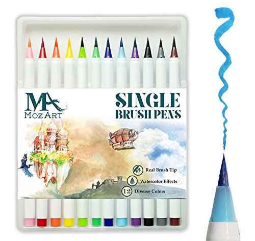 Brush Pen Set - 12 Colors - Soft Flexible Real Brush Tip, Durable, Premium Grade,Create Watercolor Effect - Best for Adult Coloring Books, Manga, Comic, Calligraphy - Dual Thickness - MozArt Supplies