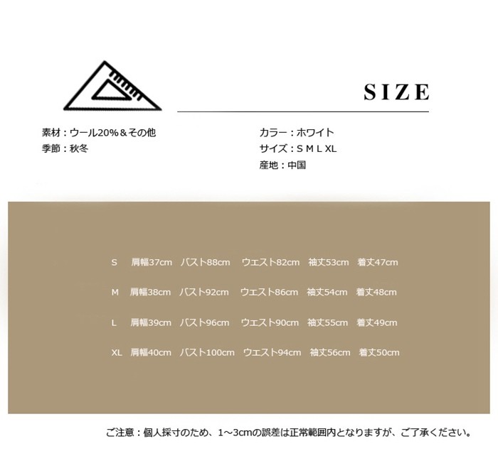 チェスターコート レディース 大きいサイズ ショート丈 秋冬アウター 無地 ウールコート レディース ジャケット 通勤 2018秋冬新作 チェスターコート 大きいサイズ レディース ショート アウター商品詳細素材:ウール20%&その他季節:秋冬カラー:ホワイトサイズ:S M L XL産地:中国サイズ参照表S 肩幅37cm バスト88cm ウエスト82cm 袖丈53cm 着丈47cmM 肩幅38cm バスト92cm ウエスト86cm 袖丈54cm 着丈48cmL 肩幅39cm バスト96cm ウエスト90cm 袖丈55cm 着丈49cmXL 肩幅40cm バスト100cm ウエスト94cm 袖丈56cm 着丈50cmご注意:個人採寸のため、1~3cmの誤差は正常範囲内となりますが、ご了承ください。チェスターコート レディース 大きいサイズ ショート丈 秋冬アウター 無地 ウールコート レディース ジャケット 通勤 2018秋冬新作 チェスターコート 大きいサイズ レディース ショート アウター