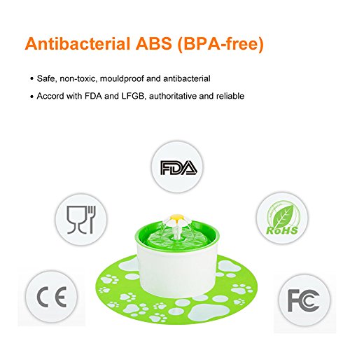 Studio : Petacc Publisher : Petacc Binding : Misc. Product Description Information What a powerful pet water fountain! 2 drinking patterns make your pet drink freely and high-iodine activated carbon guarantees excellent water quality! If you want to know more details or have any questions, please look through the detailed page or contact the customer service. ??????????????????????????????????????????????????????????????????????????? Feature Material: ABS Size:diameter 7.5"/190mm; height 4.5"/115mm; max height 6.3"/160mm Water storage capacity: 1.5L Pump power: 2W Power line: 5.9ft/1.8m Power output: AC 12V Certified?by: FDA, LFGB, CE, UL, RoHS Color: green Package list: 1x pet water fountain 1x activated carbon filter cotton 1x immersible pump 1x silicone pad 1x charger (AC 120V/9W) 1x user manual Notice * The actual color may vary slightly from the online image due to monitor color settings. * Please allow slight measurement deviation for the data. Package Including -1x pet water fountain -1x activated carbon filter cotton -1x immersible pump -1x silicone pad -1x charger (AC 120V/9W) -1x user manual 0