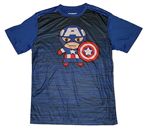 -. Binding : Apparel -. Brand : Marvel Comics -. Color : Blue -. Department : mens -. Feature : Front of the shirt features Captain America. / Officially Licensed Product. / Adult Men Size. / 100% Polyester. -. ProductGroup : Apparel -. ProductTypeName : SHIRT -. Title : Marvel Comics Captain American Avengers Kawaii Active Poly Graphic T-Shirt