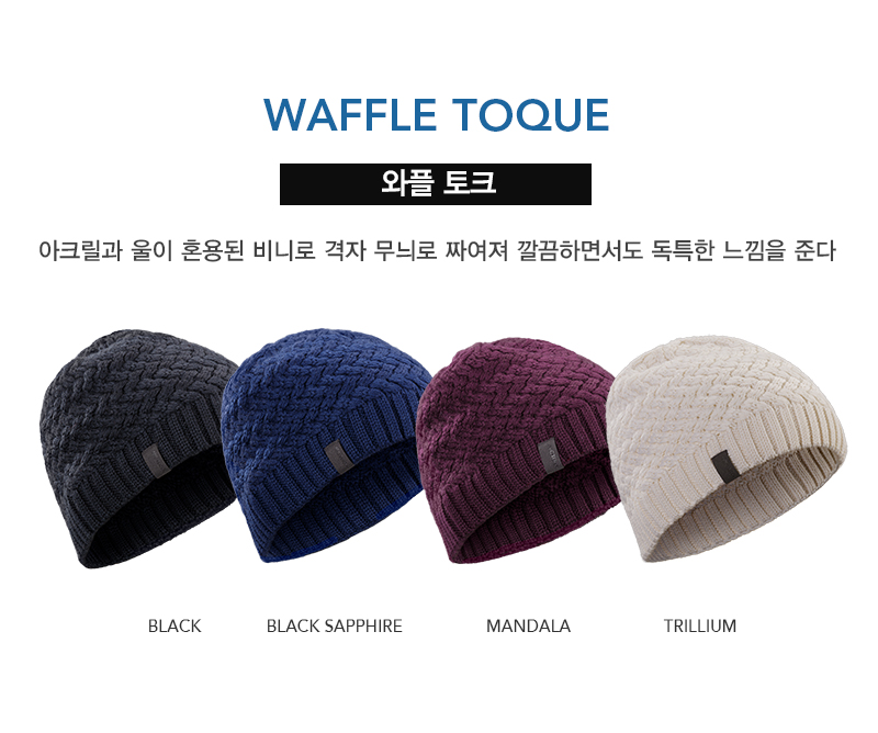 WAFFLE TOQUE (와플 토크),아크릴과 울이 혼용된 비니로 격자 무늬로 짜여져 깔끔하면서도 독특한 느낌을 준다사용추천Around Town착용 핏One-size-fits-all소재· Wool blend사이즈/무게ONE SIZE / 75g